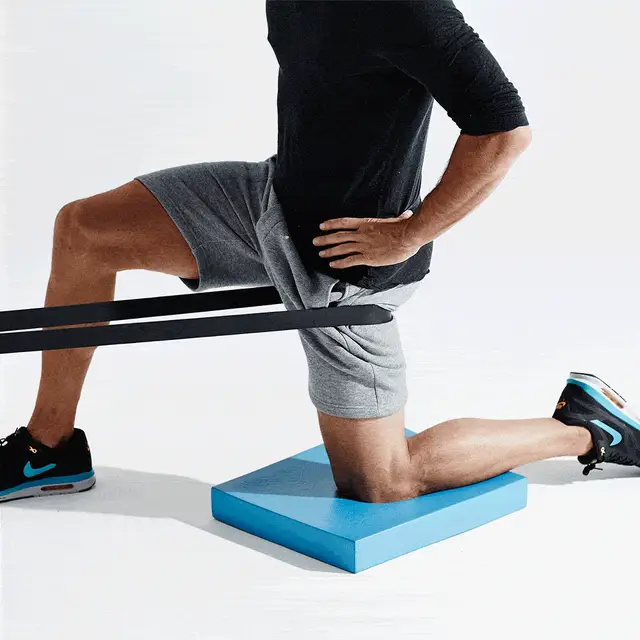 Place a foam mat or yoga block on the floor, then secure the end of a band around something solid, like a cable column or machine. Step your left leg through the opening of the band, facing the machine, and kneel your left knee onto the foam mat, directly beneath your hip, keeping right foot flat and right knee bent about 45 degrees. The band should be taut and directly beneath your glute. Place your hands on your hips, and gently drive your hips forward, keeping your pelvis pulled up to keep tension in the hip flexor, until your knee is bent 90 degrees. Continue for one minute; try moving forward and back slightly, keeping the pelvis tucked, then try moving hips side to side as well as making small circles to the left and to the right with your hips. Switch legs and repeat.