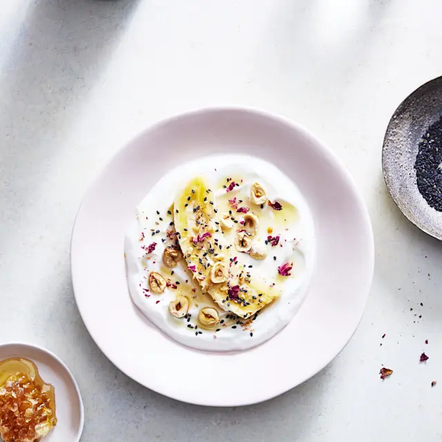 1. Combine yogurt with banana and honey, then top with hazelnuts, sesame seeds, and rose petals.