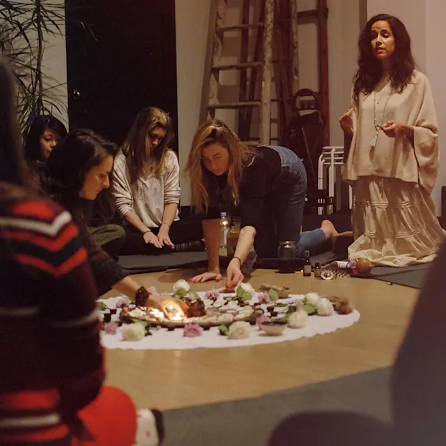 It’s 7 p.m. on a late April evening. In a couple of hours, the full moon will be visible. I arrive at a Greenwich Village apartment wrapped in my giant mohair sweater. Inside, there is a beautiful circular cloth in the middle of the room that is adorned with candles, flowers, and quartz crystals. I normally add my jewelry or another personal item, and this time it’s the manuscript to my upcoming book.