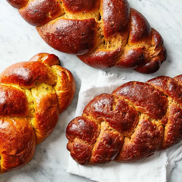 Instead of buying pre-made challah, Brooklyn-based recipe developer Beth Lipton recommends making it yourself, and taking pleasure in the meditative experience of braiding and glazing the bread. Because most loaves are prepared with gluten and eggs, she created three varieties to satisfy various diets. “These challahs all bring something special to the table, whether you’re managing a dietary preference or just want to put a twist on a classic favorite,” she says.