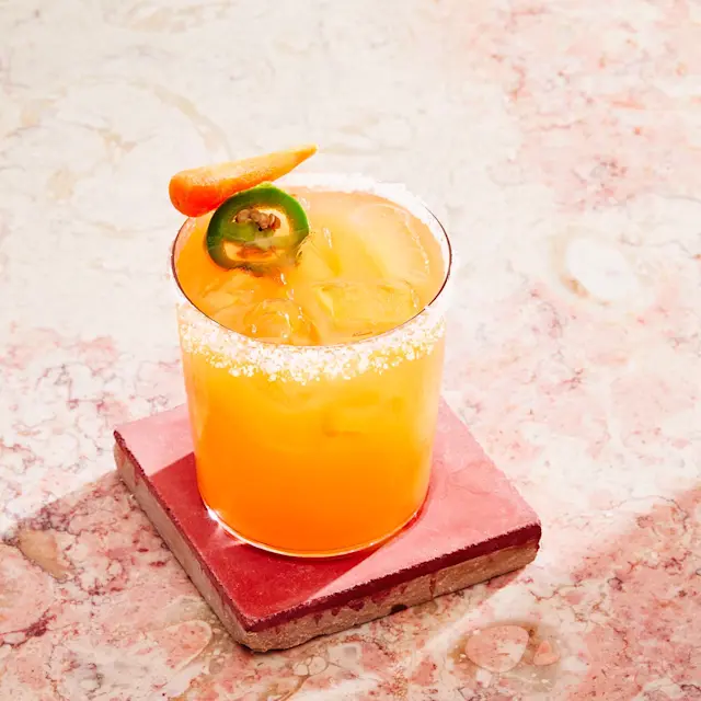 “Naturally-sweet carrot juice pairs nicely with triple sec and lime,” says New York City–based recipe developer Laura Rege. Research shows that drinking carrot juice provides high levels of antioxidants and can protect the cardiovascular system. The addition of charred jalapeño provides a subtle, smoky flavor and a hit of spice. “Rather than using well triple sec, which is basically sugar, look for triple sec that has been made by smaller distilleries where artisans put time and attention into making a quality spirit,” suggests Rege. She favors this one, along with reposado tequila which, she says, has a smoother, sweeter flavor profile. If you can find baby carrots with leafy tops, use them as a garnish.