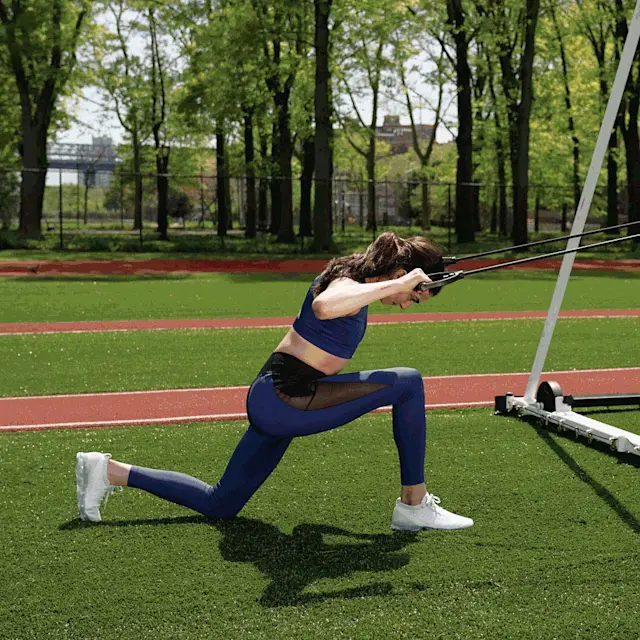 Loop a resistance band around a sturdy anchor point at about chest height. Hold the handles and stand far enough from the anchor point that there’s resistance in the band. Lower into a reverse lunge with the left leg and tilt your head down so it’s in line with the band. At the bottom of the lunge, pull the handles toward you until your elbows are in line with your shoulders. Reverse the motion to return to start for one rep.