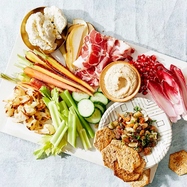 For an omnivorous balance of meats, seasonal produce, and interesting dips, Furthermore created the high performer's entertaining board. It makes a perfect appetizer for four or a light main dish for two. Nitrate-free salami provides protein, while seasonal vegetables like celery, carrots, pomegranate, pears, and endive are served raw. Cauliflower is simply roasted with olive oil, salt, and pepper though you could leave the florets uncooked. Apricot-almond herb sauce and hummus are included here, but could be replaced with any preferred dip, like baba ghanoush, tzatziki, or guacamole.