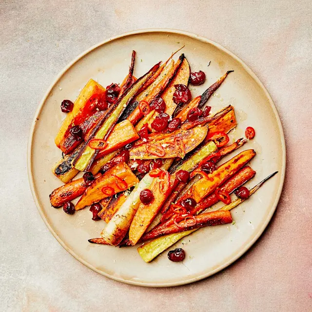 "Sweet potatoes and carrots are both very strong sources of beta-carotene," says Brooklyn-based recipe developer Ali Slagle. "They're also starchy, so it's nice to balance them out with spicy and acidic ingredients." Here, the root vegetables are roasted at a high temperature and tossed with fresh cranberries and a zingy chili-lime dressing. If you prefer lemons to limes, sub in lemon zest and juice instead.