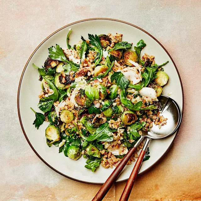 "This is a day-after-Thanksgiving salad: It uses leftover turkey and grains, and you could also swap in any roasted vegetables you have for the Brussels sprouts," says Brooklyn-based recipe developer Ali Slagle. The recipe features already-cooked farro, which turns crisp in the oven and provides texture. "Turkey is a lean meat," adds Slagle, "so it needs added flavor. Coating it in whole-grain mustard before roasting is a light way to do that." If you're not a fan of horseradish, use mustard instead, or simply combine oil and vinegar.