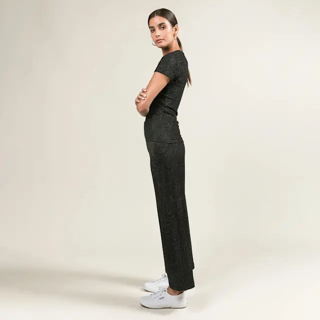 Try this metallic duo for relaxing by the fire or to celebrate New Year's Eve. Tuck the top into the pants and pair with slippers or strappy heels, depending on your mood or activity.