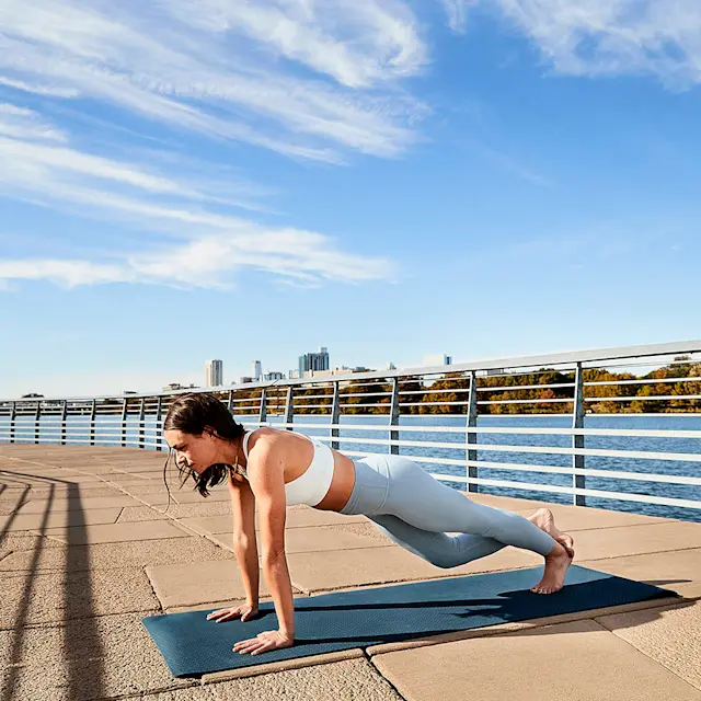 How: Get in a high plank with shoulders stacked over wrists. Inhale and place the toes of your right foot on the back of your left heel. Exhale and press down on your heel, bringing it closer to the floor. Inhale and release. Continue, then switch sides and repeat.