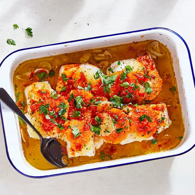Roasted citrus cod with harissa vinaigrette
